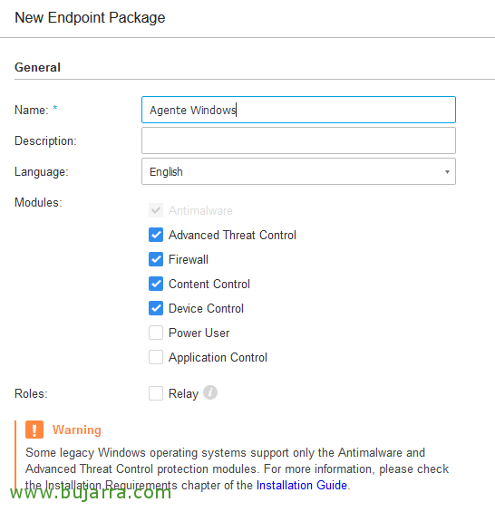 Primero, debemos crear el paquete desde el panel de Control, vamos a “Network” > “Packages” > “Add…”. Seleccionamos el idioma y los módulos que queremos que tenga de protección, normalmente “Advanced Threat Control”, “Firewall”, “Content Control” y “Device Control”.