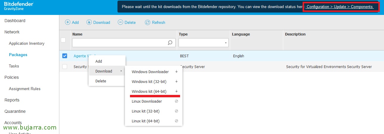 Nos situamos en: “Configuration” > “Update” > “Components” y nos descargamos el agente para nuestro SO necesario, sea Windows o Linux.