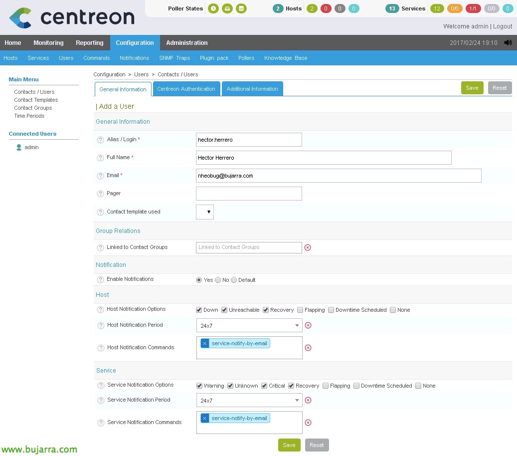 - Alias / Sartu: Será el login que usará si le queremos dar también acceso a Centreon.