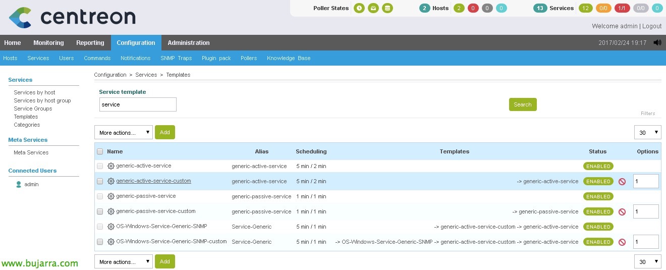 Ondo, antes de crear cualquier servicio, si por ejemplo queremos hacer lo dicho, que todos los servicios que creemos a partir de ahora se le notifiquen, podremos editar una plantilla de servicio que trae Centreon. De esta plantilla, luego nosotros crearemos los servicios que monitorizan los ítems que nos interesen. Estas plantillas base pueden tener ya una configuración básica que sea lo dicho, que la notificación esté habilitada, a este usuario, eta abar… Podremos crear una plantilla duplicando una existente si queremos, en este caso editare la plantilla ‘generic-active-service-custom’ que encontraremos en “Konfigurazioa” > “Zerbitzuak” > “Txantiloiak”. En otros documentos veréis que todos los servicios que crearé, parten de esta plantilla!