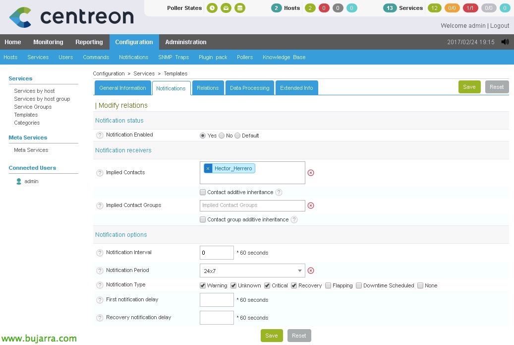 Lo primero será definir un usuario al que queremos que se le envíen las alertas, posteriormente tocaremos una plantilla de servicio base, para que todo lo que trabajemos tenga habilitadas las notificaciones y a este usuario en concreto; y no tengamos que configurarlo cada vez que creemos un nuevo servicio.