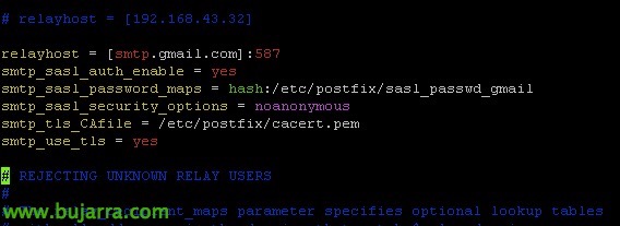 Bastará con editar el fichero de configuración de Postfix, añadimos las líneas de configuración contra el servidor de correo de Gmail: