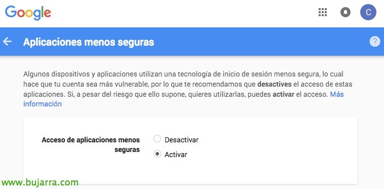 Eta azkenik, tendremos que permitir que Gmail nos deje enviar correos, deberemos entrar en ambos enlaces con nuestra cuenta de Gmail para permitir aplicaciones menos seguras:
