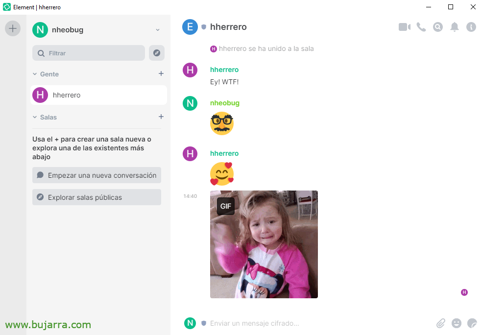 Y nada, si entramos ya Element nos da la bienvenida, nos permite enviar mensajes a contactos, explorar salas públicas o crear chats grupales entre otros.