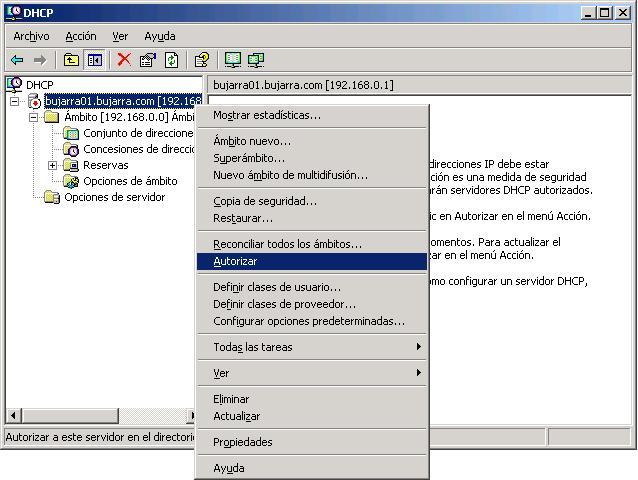 Este es un paso importante, para que funcione el servidor DHCP hay que autorizarlo en el directorio activo, si no lo hacemos el servidor no realizaria su funcion y no asignaria IP’s a los puestos.