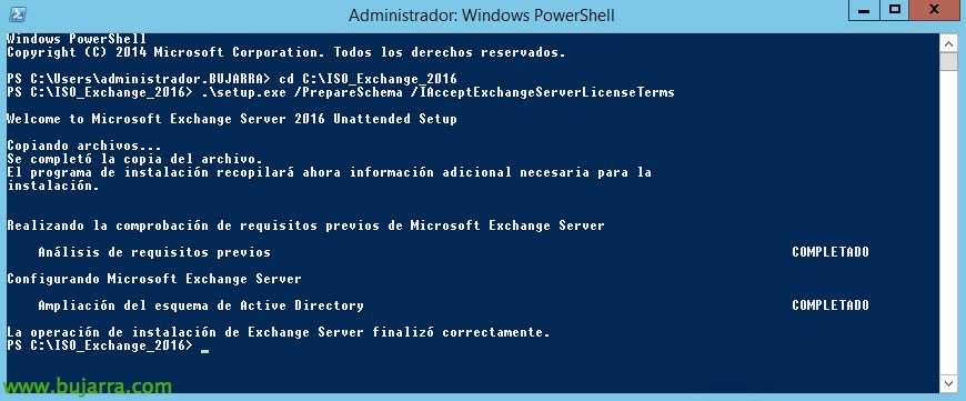 不错, para extender y preparar el Active Directory para nuestro nuevo Exchange 2016, podremos realizarlo de dos formas, si disponemos de un AD pequeño, podemos dejar al asistente de instalación que detecte y realice los pasos necesarios en nuestro DA, para ello deberemos ejecutar la instalación como miembro de los grupos de seguridad Administradores de esquema y Administradores de empresa del dominio. O manualmente siguiendo los siguientes pasos:
