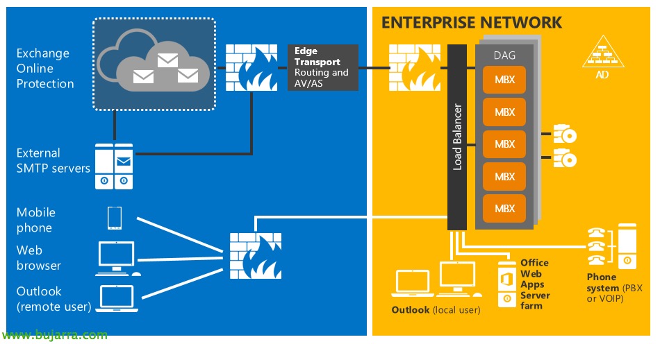 Los roles Mailbox o Buzones y Client Access o Acceso de Cliente ya no están separados como en Exchange 2013, ahora están unificadas todas sus funciones en el rol de Mailbox. Tiene las siguientes funciones: Servicio de Bases de Datos, Mensajería Unificada, Servicio de Transporte y cualquier función que trae el Client Access como es OWA, ActiveSync…