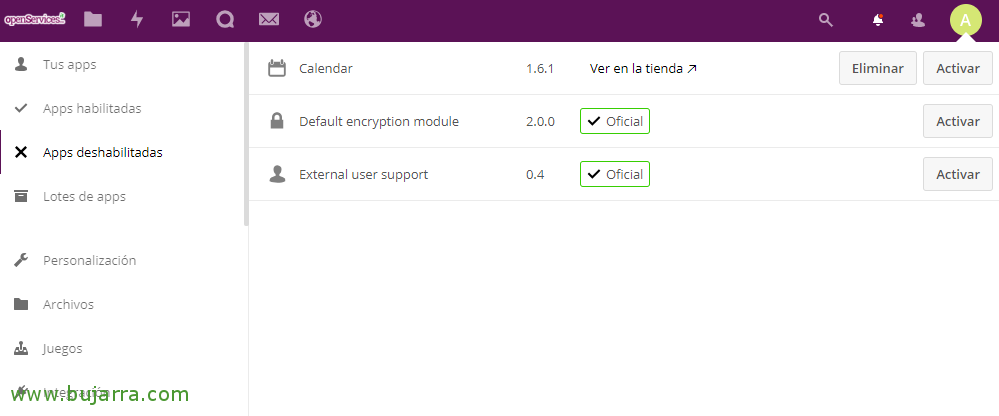 Tras copiar la app a la carpeta de Apps de Nextcloud, podremos acceder como un administrador al menú de Apps y en “Apps deshabilitadas” podremos encontrar el Calendario y habilitarlo! pulsamos sobre “Activar”,