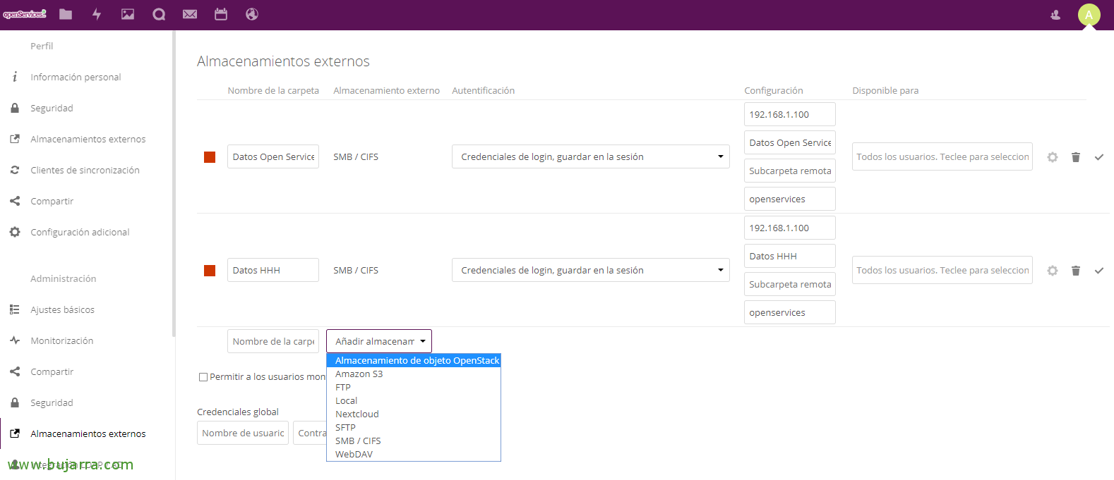 Uma vez preparado o ambiente, será tão simples como a partir do site de administração Nextcloud para acessar o “Configuração” > “Armazenamento externo” e criar os recursos que nos interessam. Poderemos autenticar diretamente a partir daqui com uma conta para montar o armazenamento diretamente, ou selecione passar pela conta do usuário com o depósito a ser montado (Este é geralmente o meu favorito), indicamos o Servidor que partilha, O nome da partilha, e, opcionalmente, os usuários que verão o ponto de montagem & Confirmar!