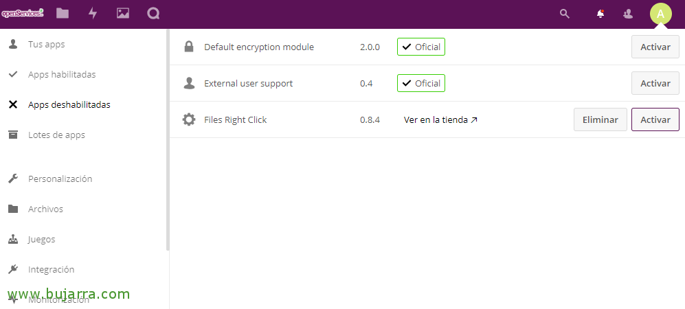 We will now be able to access the Nextcloud interface as an administrator and in “Apps” > “Disabled apps” envelope “Files Right Click” Click on “Activate”,