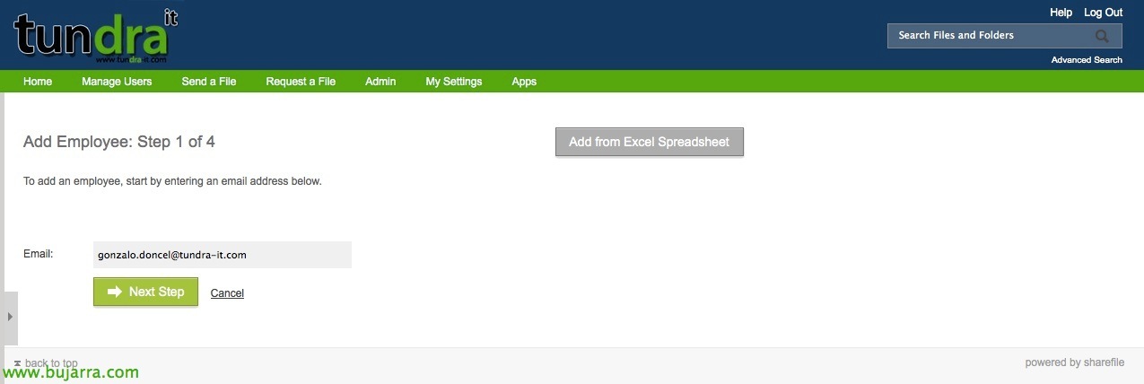 Nicht schlecht, Jetzt können wir Benutzer in Citrix ShareFile erstellen, um ihnen den sicheren und kontrollierten Upload und Austausch von Dateien mit anderen zu ermöglichen! Um dies zu tun,, seit “Benutzer verwalten” Wir klicken auf “Mitarbeiter erstellen”