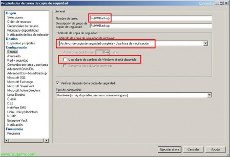 Im Teil von “Konfiguration” > “Allgemein” debemos indicar antes de nada el ‘Nombre de tarea’ con el mismo que acabamos de indicar en los comandos Pre y Post tarea. In “Método de copia de seguridad de archivos” Auswählen “Archivos de copia de seguridad completa – Usar hora de modificación” y desmarcamos el check de “Usar diario de cambios de Windows si está disponible”.