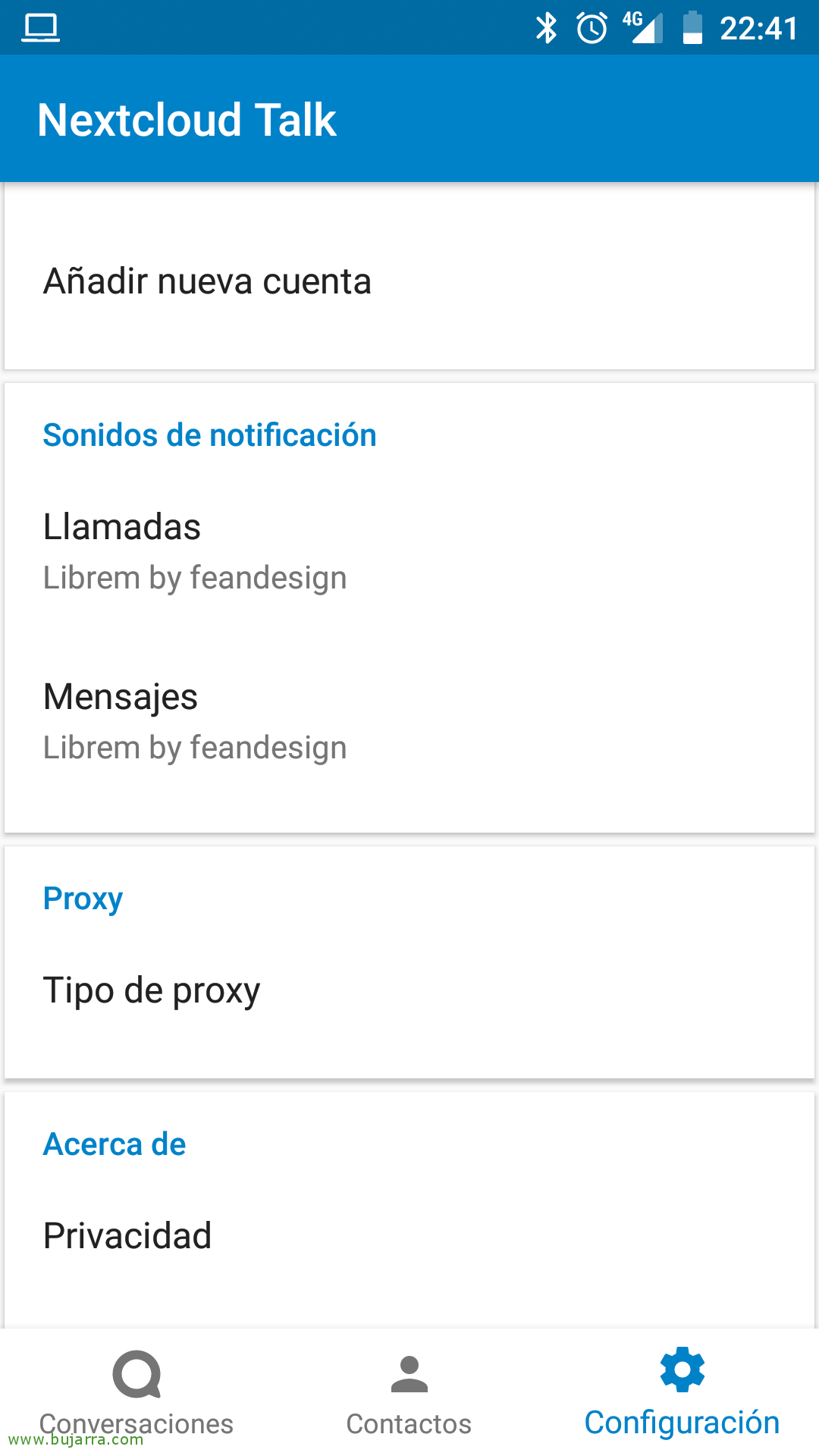 Y por cierto, nos podremos bajar la aplicación de Nextcloud Talk del Play Store o del App Store, con ella podremos chatear y sustituir al WhatsApp, al menos para esas conversaciones privadas de asuntos profesionales, que, quizás nadie deba enterarse 😛 Podremos ver las Conversaciones que tenemos activas, los Contactos y un menú de Configuración para las notificaciones, etc…