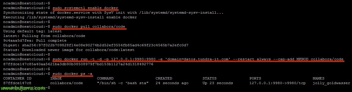 次のコマンドで, Dockerサービスとしてスタートします, イメージのダウンロードとインストールに加えて、 'Collabora/Code’ リポジトリから, ポートを示して起動します (9980 x デフォルト) サービスの FQDN ドメインを示すだけでなく、. そして、開始されているかどうかを最後に確認します (コンテナの識別子をメモします).