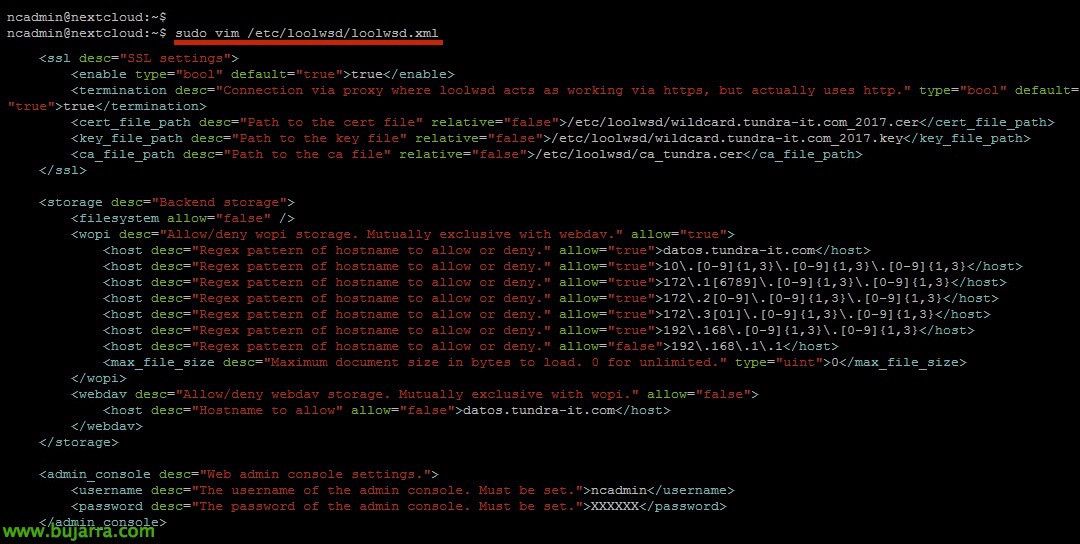 Editamos el fichero de configuración donde indicaremos el FQDN del sitio además del usuario y contraseña del administrador de Nextcloud.