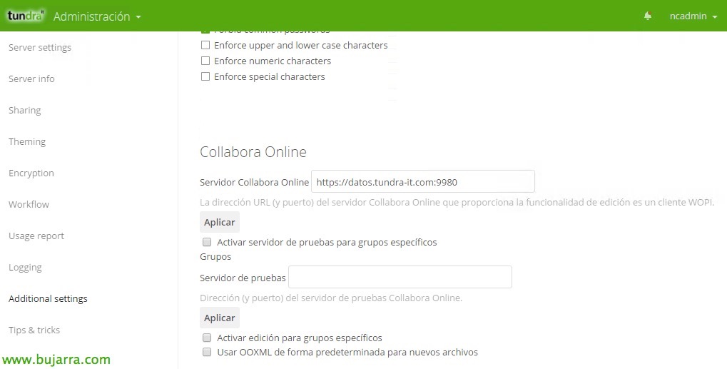 アクティブ化したら, から “行政” > “追加設定”, 「Collabora Online Server」で正しいURLを見つけることができます’ HTTPS 形式://FQDNの:9980