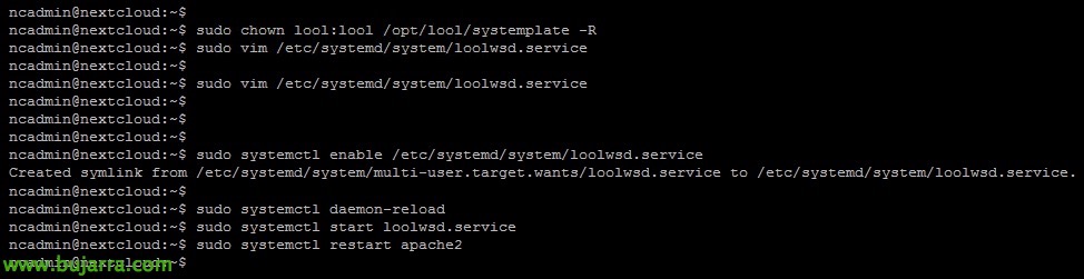 悪くありません, ユーザー'loolを作成しました’ Y realizamos correcciones de permisos, Arrancamos la plantilla de sistema y creamos el servicio.
