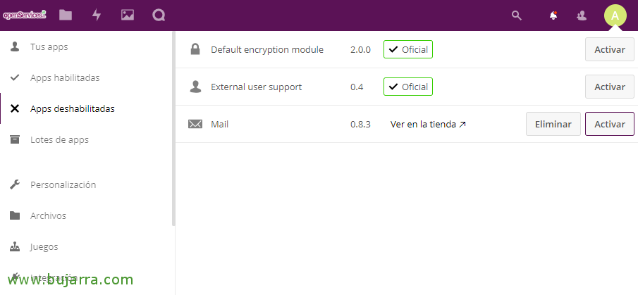 Sarà sufficiente accedere al sito web di Nextcloud con un account amministratore, Andremo al menu di “Applicazioni” > “App disabilitate”, cerchiamo quello di Mail e lo attiviamo,