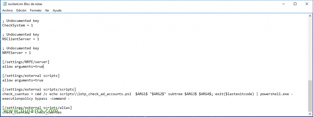 Bueno! Empezamos! Editamos el fichero nsclient.ini como ya sabemos! debemos primero definir el alias y luego el script en cuestión que ejecutará: