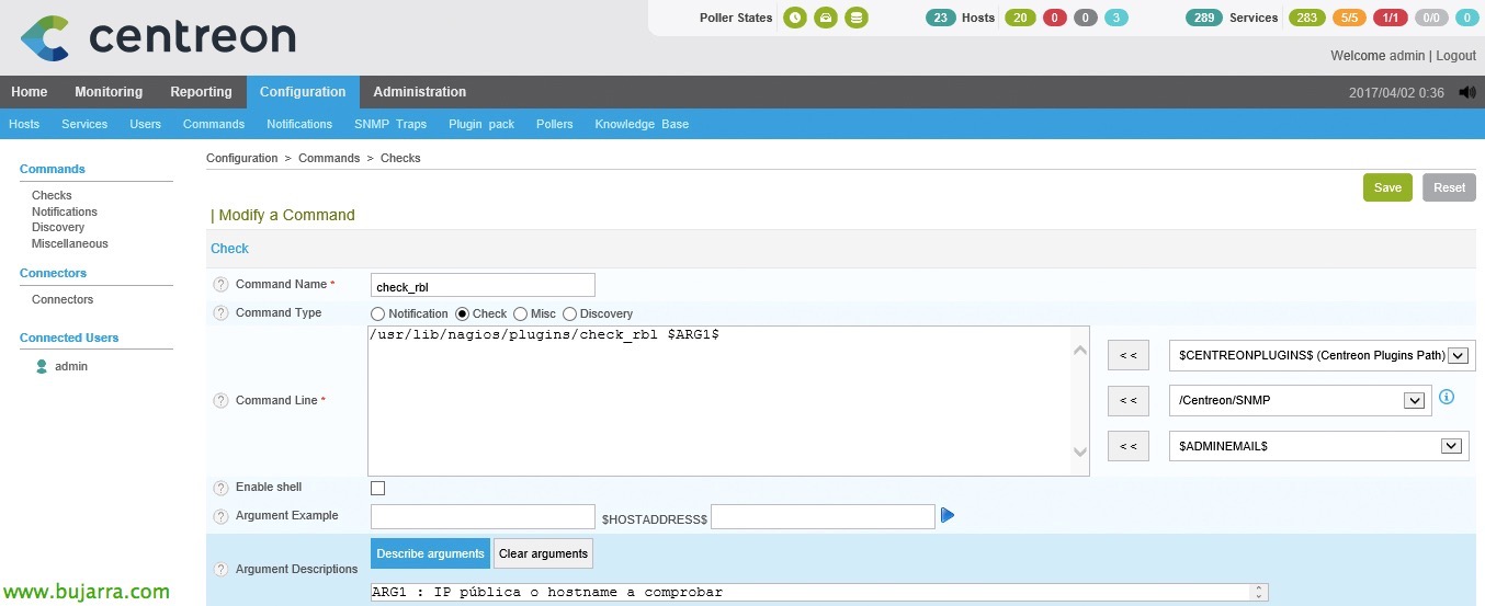 Como es habitual ya, deberemos de dar de alta el Comando que vamos a ejecutar desde Centreon, iremos a “Configuration” > “Commands” > “Add” o clonamos uno existente, como siempre! Y modificamos al menos los siguientes datos: