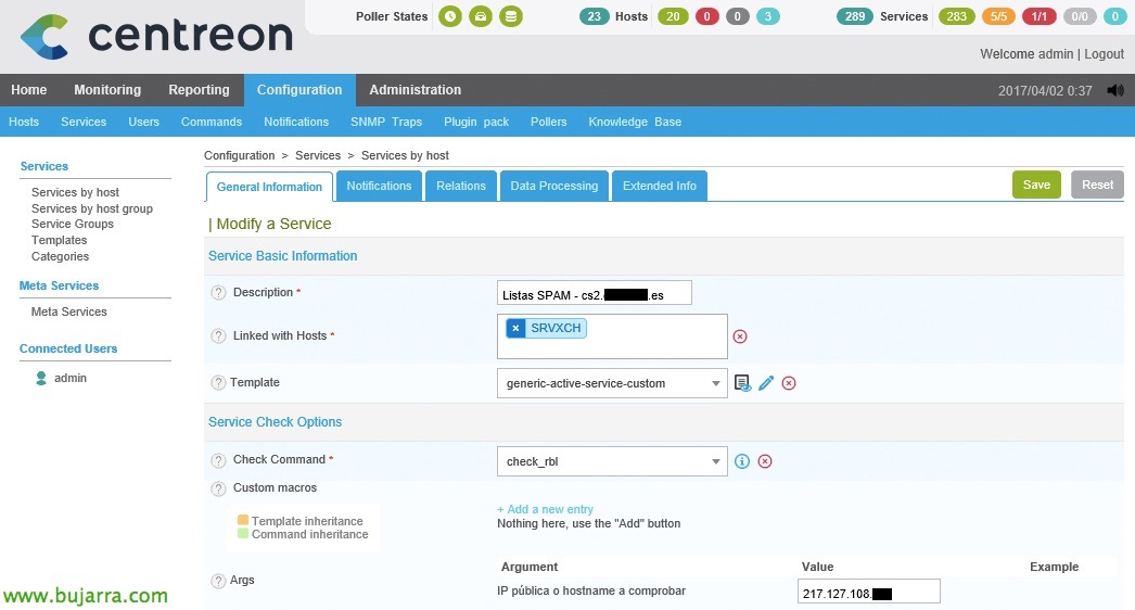 Y cuando ya tenemos el Comando creado en Centreon, pues ya podremos crear tantos servicios que nos interesen controlar, como es obvio, crearemos un Servicio con cada IP pública y/o hostname FQDN que queremos comprobar. Si tenemos 2 WAN, las monitorizaremos, además de los registros MX, si es que son en un hosting público, etc, etc…. Creamos el Servicio pues, “Configuration” > “Services” > “Add” o clonamos uno existente, dejamos los siguientes parámetros al menos: