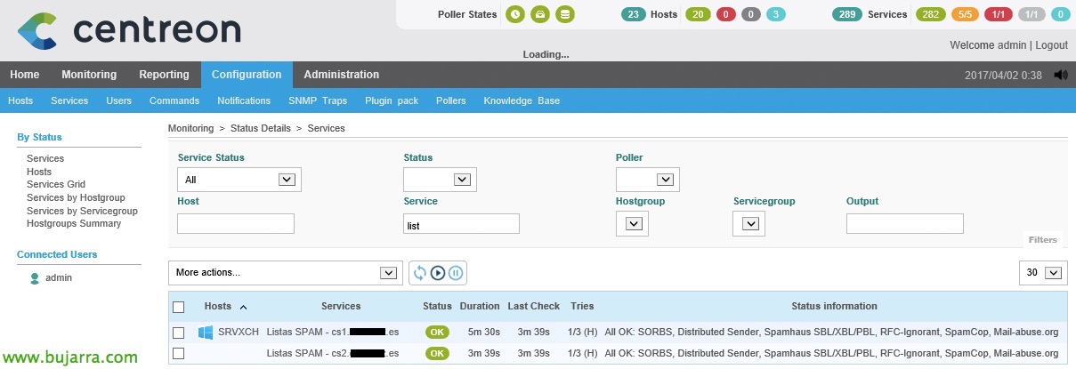 Una vez generado todo, ya podremos ir a la parte de “Monitoring” y comprobarlo! Si queremos forzar el checkeo, ya sabemos, seleccionamos los servicios que nos interesen y en el combo seleccionamos ‘Services – Schedule immediate check (Forced)’. Deberá comprobar ya nuestras IPs públicas o nombres DNS externos si están en listas negras!!! Disfrutarlo!!! A monitorizar todo!!! Hasta la abuela!!! 😉