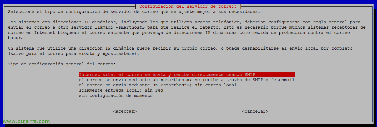 我们指示要实现的配置类型, 就我而言,我网络上没有邮件服务器,因此我希望它是直接投递. 组织中的正常情况是通过智能主机. 点击 “接受”,