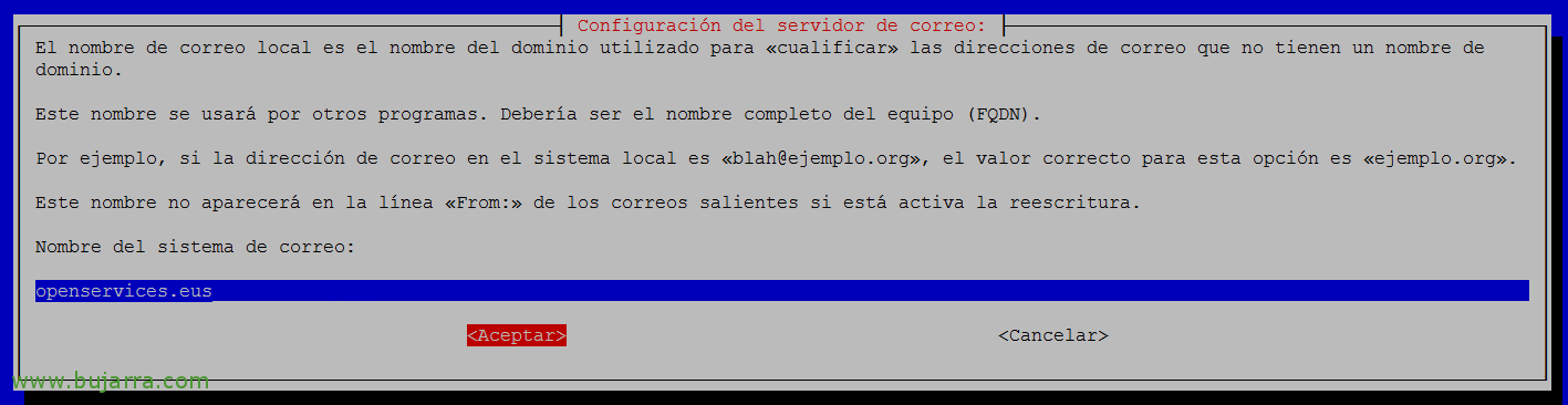 我们指示邮件系统的名称, 它必须是将发送电子邮件的公共域的 FQDN. “接受”,
