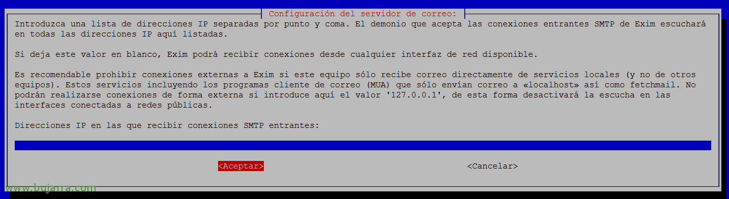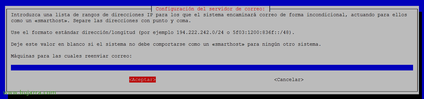 如果我们要允许他们通过这个OTRS服务器发送电子邮件,我们必须将IP地址指定为白名单, 我们留空并继续, “接受”,