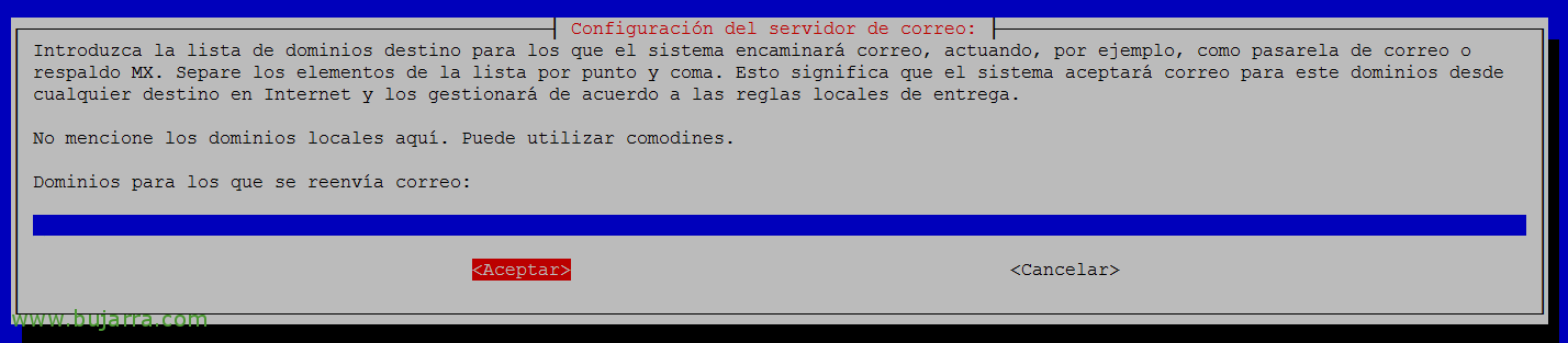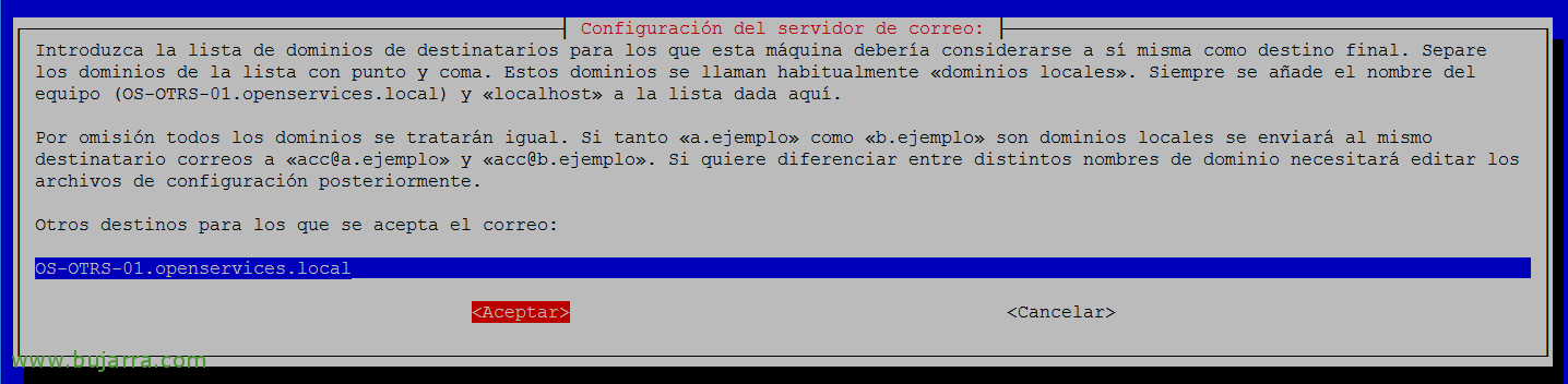 如果我们有其他域将接受邮件,我们会添加, 通常在这里,我们必须将本地域 (至少). 点击 “接受” 要关注,