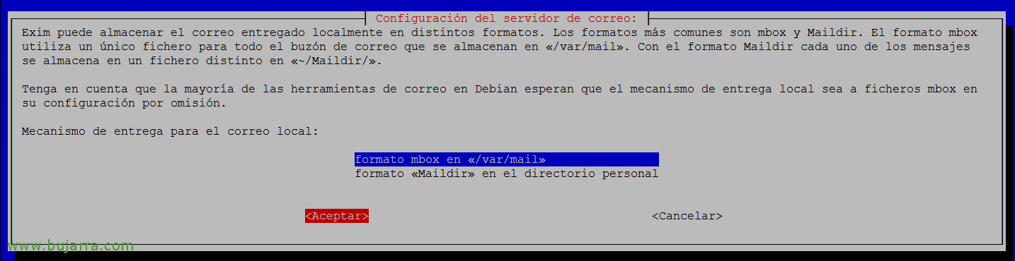 我们指明了存储本地电子邮件的格式, 通常我们会在 /var/mail 中使用 mbox 格式, 压 “接受” 继续,
