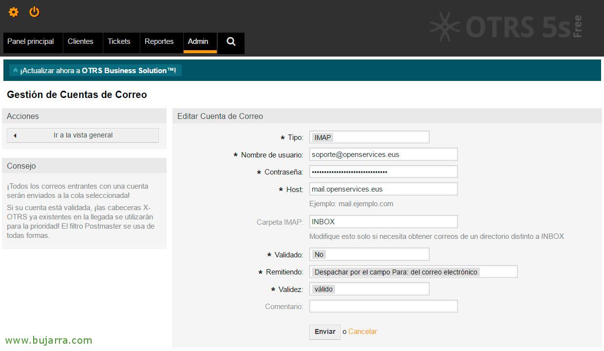 不错, 因为 “管理” > “电子邮件设置” > “电子邮件帐户” 我们可以编辑默认电子邮件帐户或根据需要添加任意数量的电子邮件地址. 这些帐户将接收来自用户的事件, 然后我们可以将它们与不同的 Queues 相关联,以便正确分类. 我们将能够使用 POP 下载所有邮件,或者简单地将您的收件箱与 IMAP 同步 (或我们感兴趣的文件夹), 我们将连接数据填写到邮箱中,并保存 “发送”.