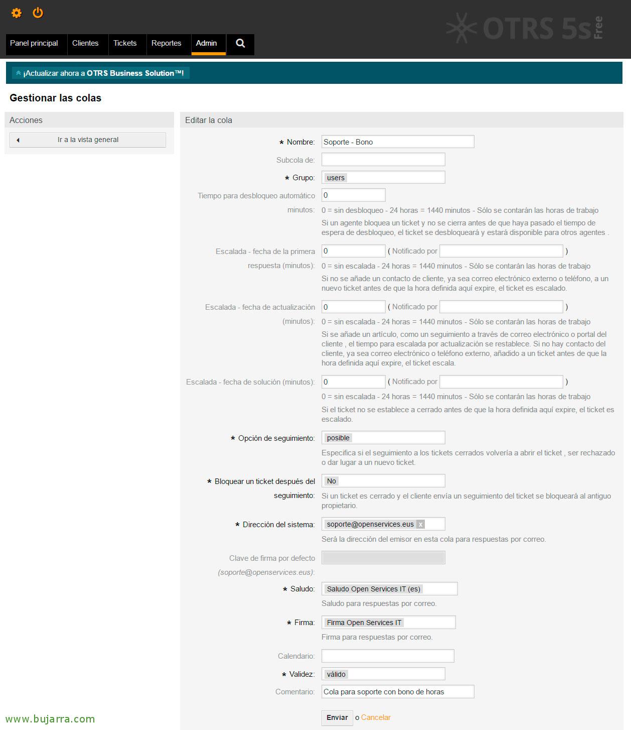 队列是工单的目的地, 遵循我最初提到的示例, 我将有不同的队列, 我将在那里对门票进行排序. 成为一家服务于其他公司的公司, 我将生成这种类型的 Queues: “支持 – 债券”, “支持 – 闭”, “项目 – 债券”, “项目 – 闭”, “课程”… 在生成工单时,我们会将其分配给一个队列,指定它们是否是项目, 或通过工时池或奖金获得高薪支持事件, 以及固定成本. 然后,我将能够通过这些队列生成过滤器,以获取一些报告以及其他奇迹.