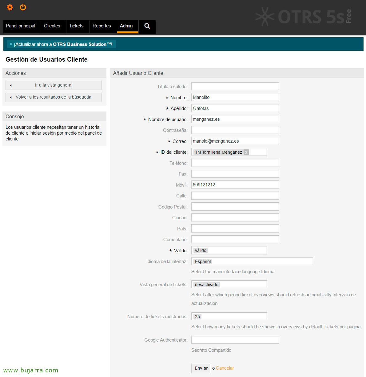 如果我们要 “管理” > “客户管理” > “客户” > “添加客户” 我们将能够注册客户的标识符及其姓名, 添加联系方式也会很有趣, 因为以后在管理您的工单时,我们将一目了然地获得这些数据.