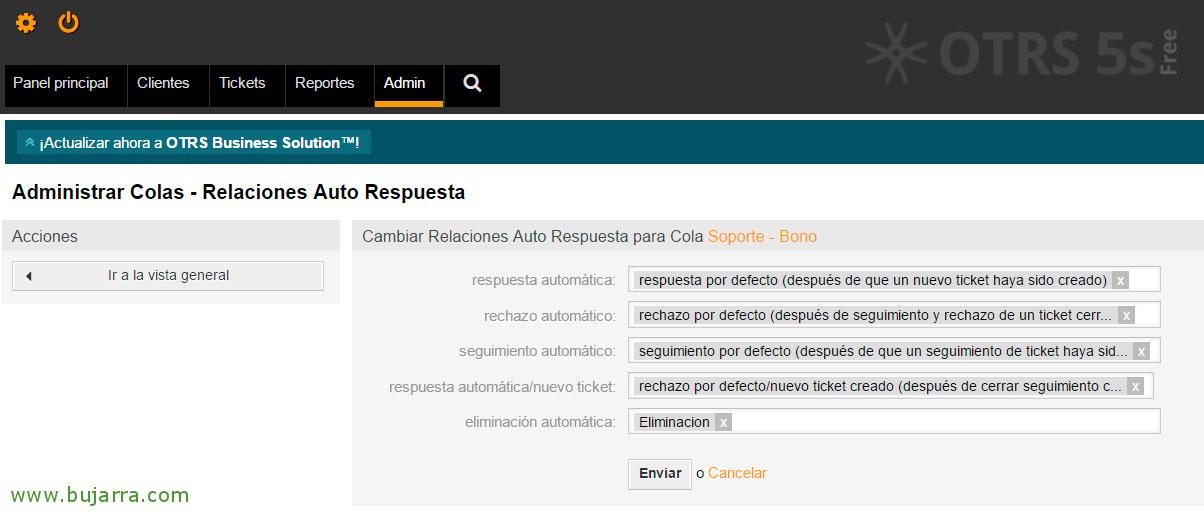 如果我们要 “管理” > “队列设置” > “自动回复 <–> 队列” 我们必须选择我们有兴趣修改的队列,我们将根据客户的交互选择一种自动响应类型, 如果工单被接受/拒绝, 关于工单跟踪和客户添加简报, 或者如果票证已删除… 我们必须为响应以下作选择一个模板: