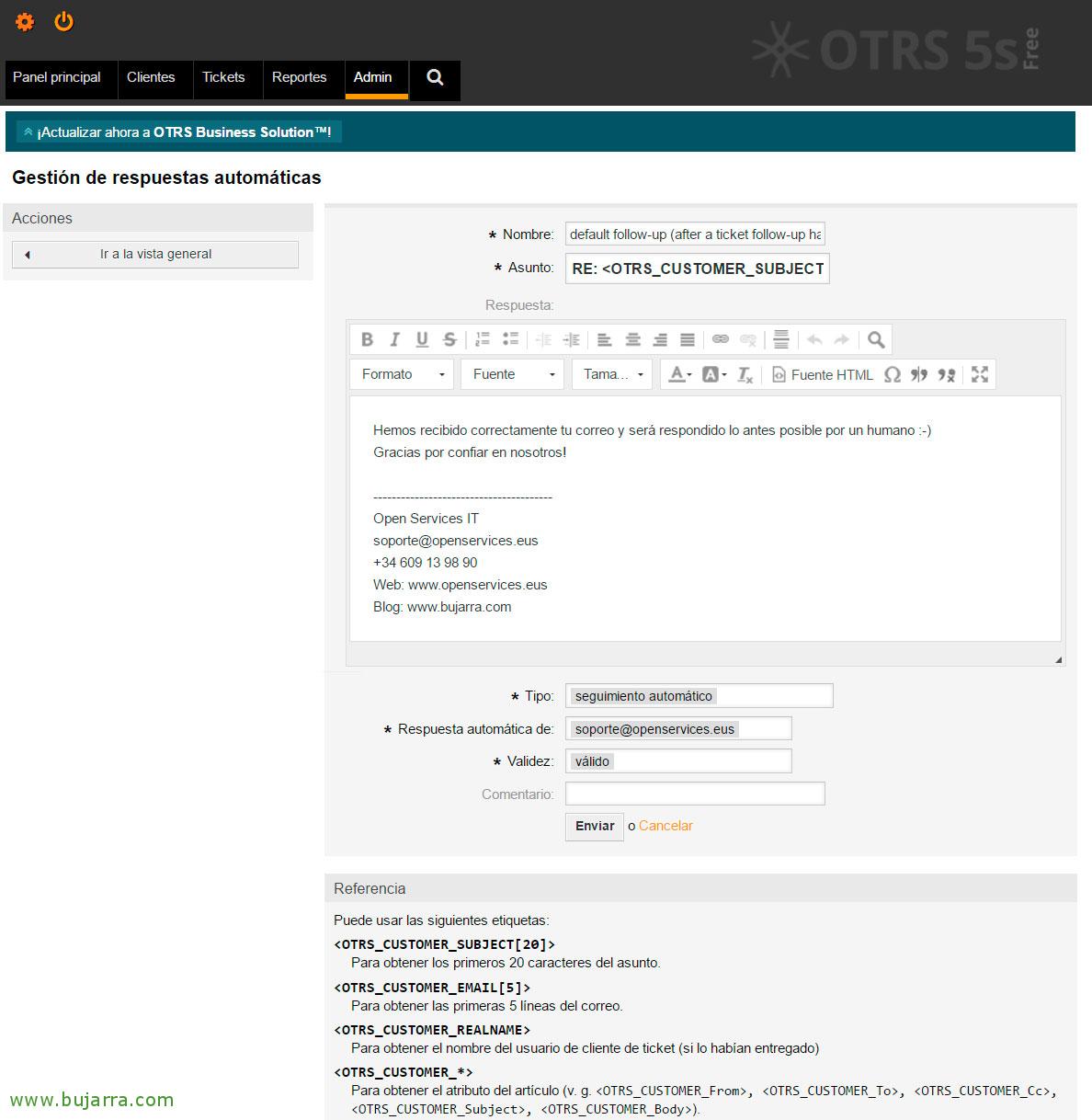我说了什么, 您必须修改或创建响应模板, 使用我们完全定制的数据, 为此, 我们将 “管理 > “队列设置” > “自动回复”. 我们将根据自己的喜好创建模板或直接修改现有模板! 我以 Base Templates 和 I 给出的内容为例, 不要忘记,每个模板都必须与响应类型以及您将用于响应客户端的电子邮件帐户相关联.