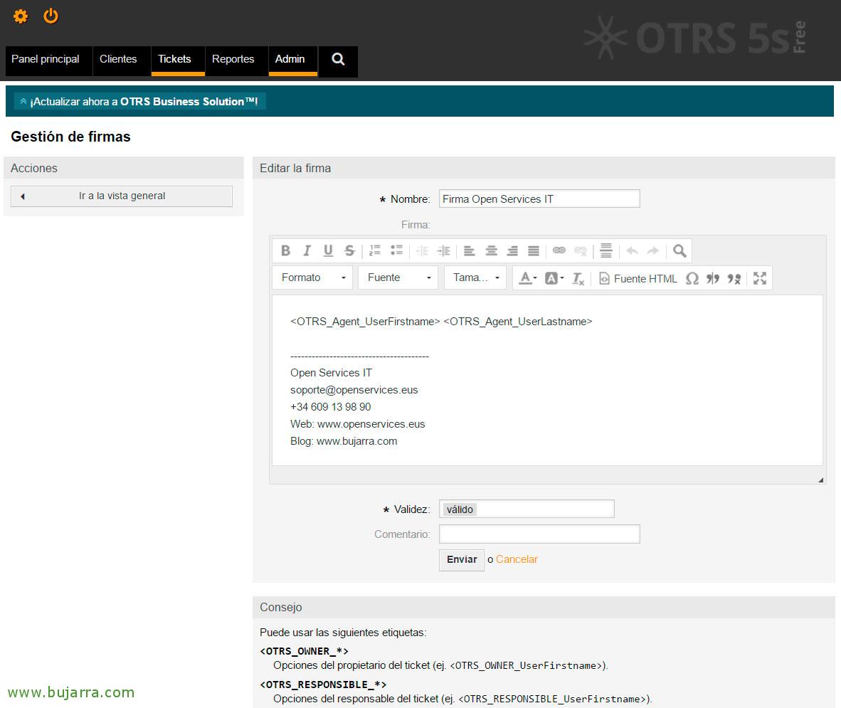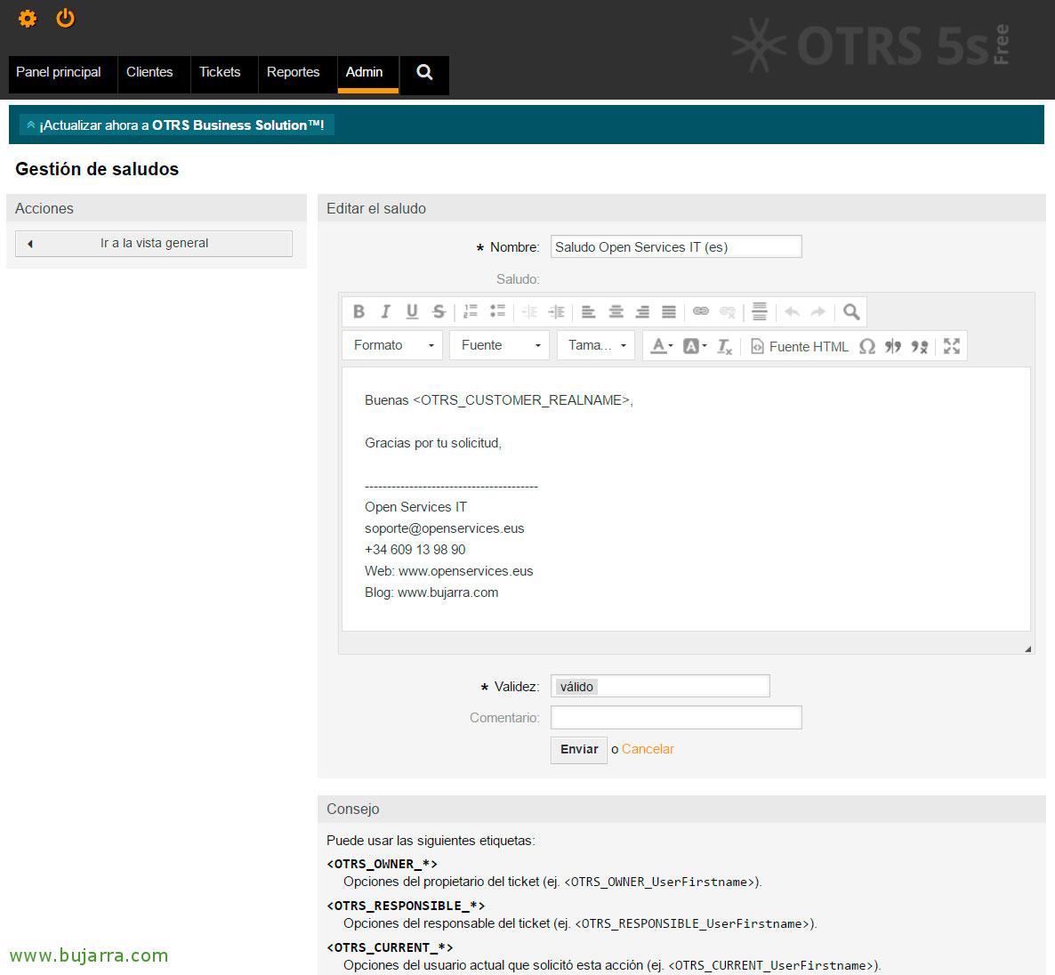 我们将在几个文档中看到一些基本配置,这些配置通常在安装 OTRS 后必须执行, 众所周知,最好的票务系统之一, 特别是因为它的可定制性, 除了开源之外! 我将详细介绍的配置将使我们能够准备好此系统以接收和管理来自用户的事件, 通过 Web 和电子邮件. 在这些文档中,我们将创建 Queues, 客户, 代理, 我们将启用自定义自动回复, 签名, 电子邮件模板, 调查, 我们将设置并报告, 或者我们将自定义 OTRS 的访问门户等!