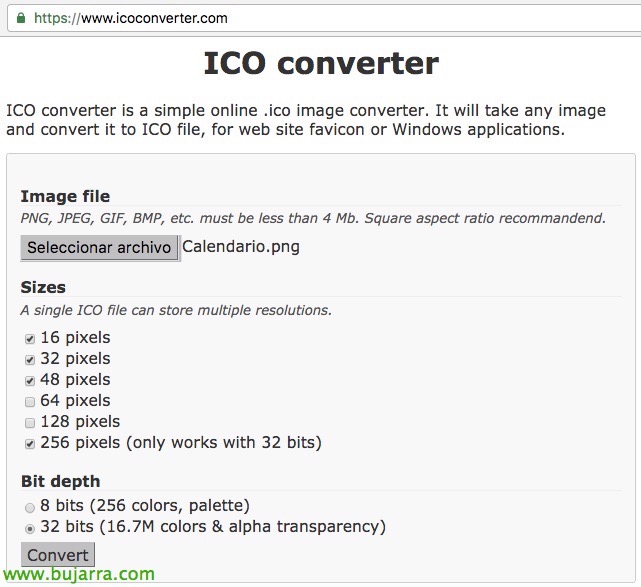 La première chose à faire sera d’avoir un fichier au format PNG que nous voulons convertir en icône, Nous irons à https://www.icoconverter.com et nous téléchargeons le fichier .png. Nous marquons toutes les tailles et cliquons sur “Convertir”, Nous téléchargeons le fichier .ico et l’enregistrons.
