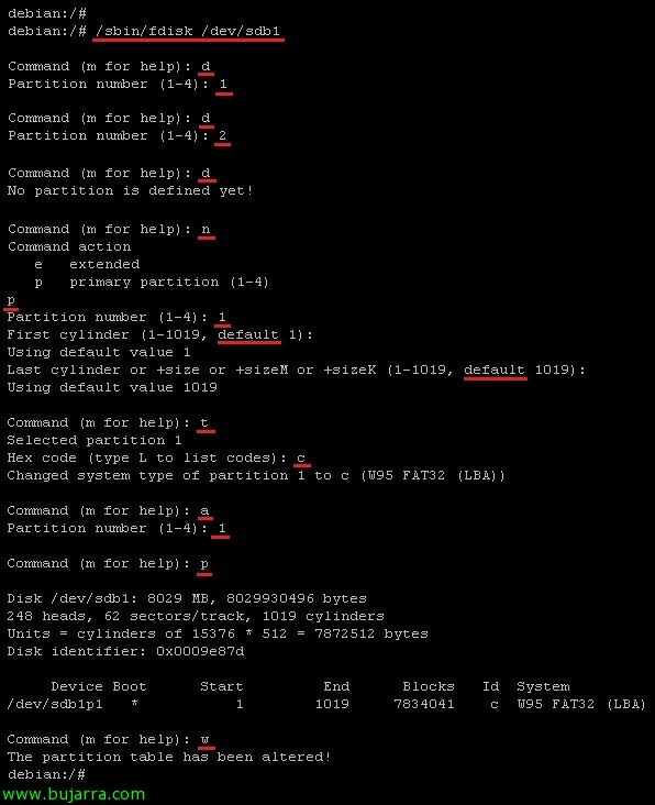 Lo primero, enchufamos el pendrive y le damos formato con ‘sbin/fdisk /dev/sdb1’, eliminamos todas las particiones que tenga con ‘d’ (‘1’, ‘2’….); una vez no disponga de particiones creamos una nueva ‘n’ e indicamos que sea primaria ‘p’ y que sea la primera ‘1’; utilizando la capacidad que nos interese (‘default’ & ‘default’ en mi caso); tipo de la partición ‘t’ debe ser FAT32 ‘c’ (W95 FAT32 (LBA)), marcamos la partición como activa con ‘a’ (la que acabamos de crear ‘1’), mostramos la configuración a a aplicar con ‘p’ y si es correcta grabamos ‘w’.
