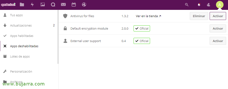 Ondo, es momento de acceder como administrador a Nextcloud e ir al menú de “Aplikazioak”, desde ahí veremos en “Apps deshabilitadas” que tenemos una nueva, debemos Activar el ‘Antivirus for files’.