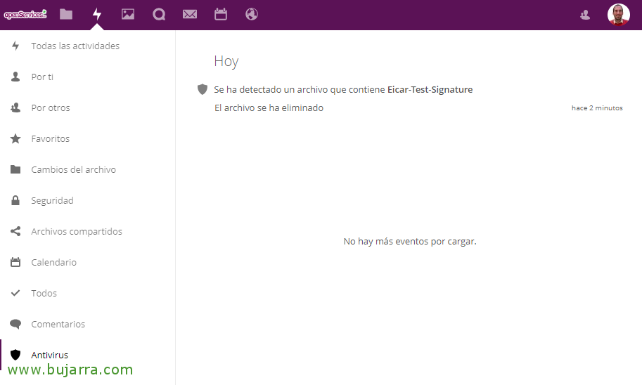 Y con eso quedaría todo listo! Si quieres prueba a subir el típico ejemplo de Eicar a ver si te lo detecta! Si has seguido todos los pasos de forma correcta podrás ver cómo el antivirus los detecta, no te dejará subir ficheros y además en el Panel de Actividad, podrás ver el registro de incidencias!