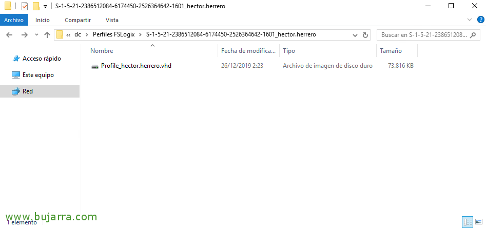 Wenn wir zum Profilpfad gehen, Wir werden sehen, wie ein Ordner pro Benutzer erstellt wurde, mit Ihrem gesamten Profil in einer VHD- oder VHDX-Datei, die Sie beim Anmelden mounten und beim Abmelden wieder aufheben. Natürlich können wir diese Festplatte manuell als Administratoren mounten, um eine Bereinigung durchzuführen (Zum Beispiel).