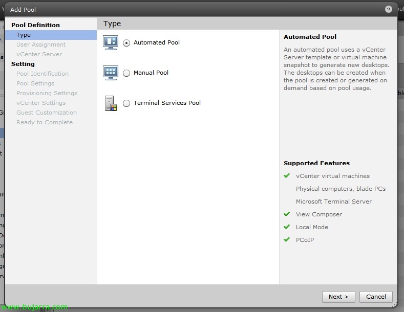 Ya podremos crear ya el conjunto de Escritorios, hierfür, Auf geht es “Inventar” > “Toto” , y pulsamos en “Add…” para crearlo, e indicamos un conjunto de Escritorios automatizado o “Automated Pool” & "Weiter", para crear unos cuantos Escritorios para los usuarios finales,