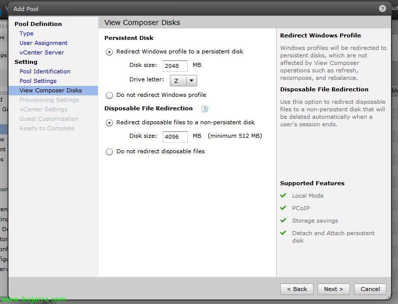 Mit VMware View Composer werden wir in der Lage sein, Desktops aus demselben Image für alle an Benutzer zu verteilen, ohne dass Sie eine Quell-VM klonen müssen, oder über eine vollständige virtuelle Maschine pro Benutzer verfügen, Das ist, Die Desktops, die wir daraus generieren, verfügen nicht über eine virtuelle Festplatte, Wenn kein Link’ auf eine Nachbildung der ursprünglichen virtuellen Festplatte. Damit erzielen wir beeindruckende Einsparungen bei der Lagerhaltung, Zum Beispiel, Wenn wir so entwerfen, dass unsere Desktops 20 GB Festplatte haben, Sie müssen diesen Betrag nicht jeder VM zuordnen, Wenn wir zum Beispiel 50 Schreibtische: 50MV x 20 GB = 1 TB Speicherplatz nur für VDI- oder VMware View-Umgebungen, Da dies nicht viel Sinn macht, wird VMware View Composer verwendet, um Desktops aus einem einzigen Image bereitzustellen, Diese neuen Desktops belegen nur ihren Auslagerungsspeicher plus Speicherplatz (wahlfrei) que queramos dar a los usuarios para que almacenen información, Was kann es sein? 0. Zu einem größeren Detaillierungsgrad wird später bekannt gegeben.