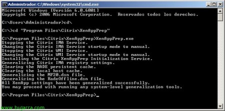 Simplemente, debemos abrir una consola DOS e ir al directorio de instalación, ejecutaremos XenAppPrep para indicar que este servidor ya está listo para ser clonado, tras la ejecución de este comando clonaremos el servidor. (Recordar que podemos ejecutarlo con el parámetro /pvs para crear un disco virtual de Citrix Provisioning Server),