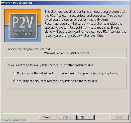 Nos indica que no tiene por que funcionar con este asistente, si no funcionase, deberíamos hacer una clonación del disco con una aplicación de terceros y luego configurarla con el P2V. “Aceptar”,