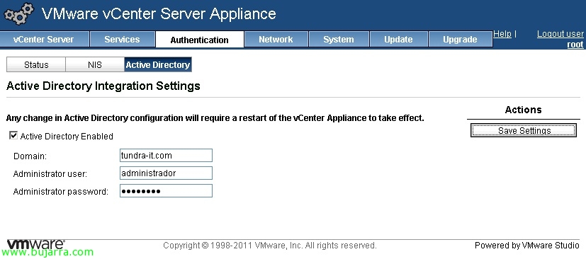 Si nos interesa, podremos integrar VMware vCenter Appliance con el Directorio Activo, bien para la autenticación de la administración o bien posteriormente para configurar logons mediante el cliente de vSphere. Marcamos “Active Directory Enabled”, indicaremos el dominio y el usuario con privilegios de administrador & “Save Settings”,